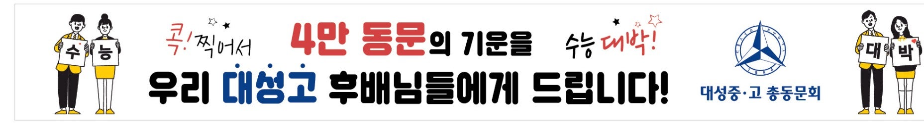 12월 3일 수능시험을 맞이하여 283명 고3 후배들의 수능대박을 위해 시험장이 있는 4개교에 동문회에서 응원의 플랭카드를 게시하니 동문들께서도 많은 응원 부탁드립니다.