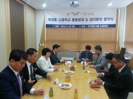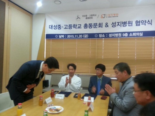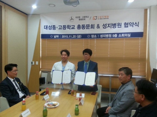 대성중.고총동문회와 성지병원과의 서비스 협약식을 11월20일 오후4시에 성지병원에서 개최 하였습니다.윤한중동문회장님..고재덕.이강률부회장님 그리고 홍현철사무총장..송근영 사무국장 참석 하였습니다.동문들의 적극적인 이용과 혜택을 누리시길 바랍니다.이용에 따른 결재시 대성동문임을 말씀드리면 혜택을 받을 수 있습니다.자세한 협약 내용은 오늘 이후에 홈페이지를 참조해 주세요ds1954.com