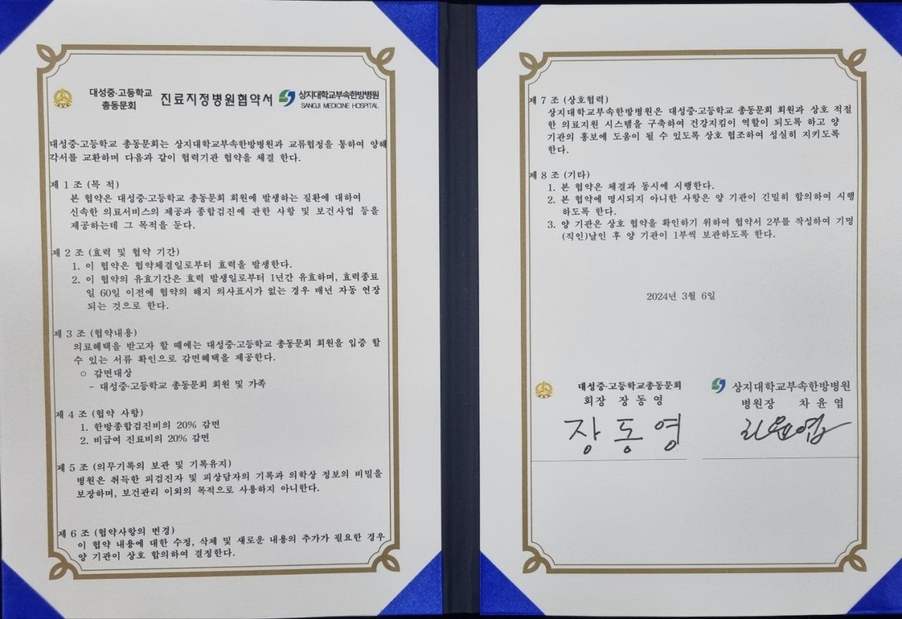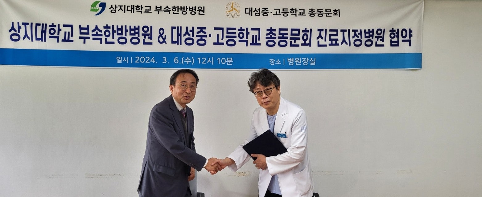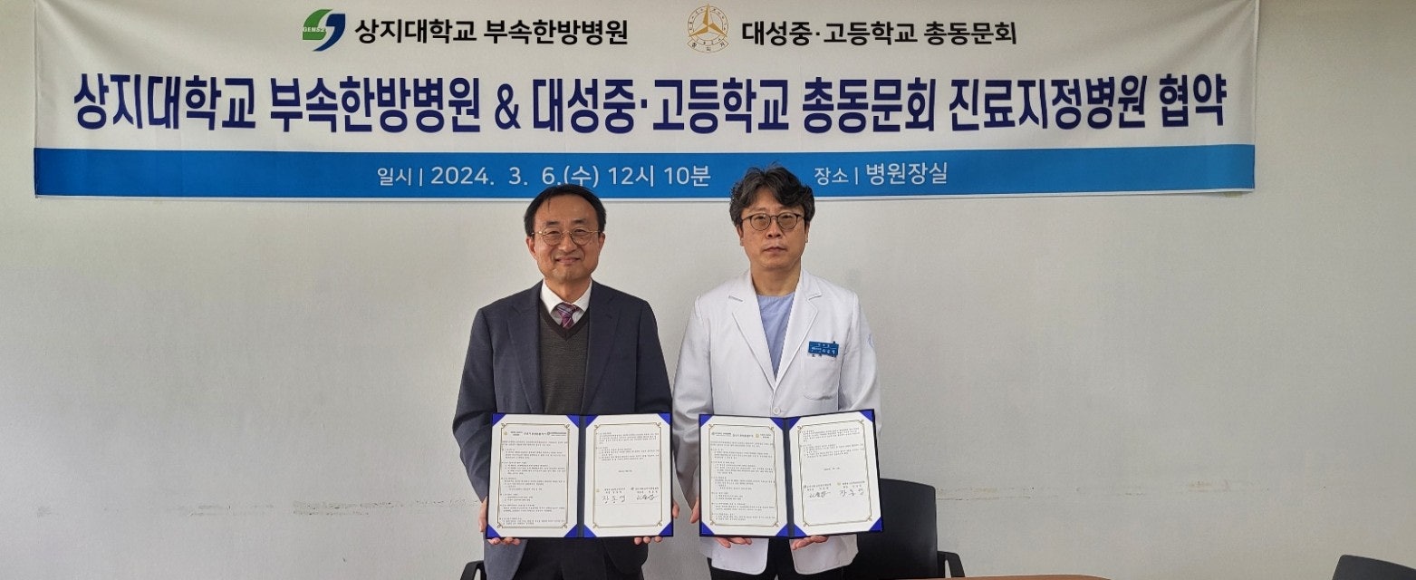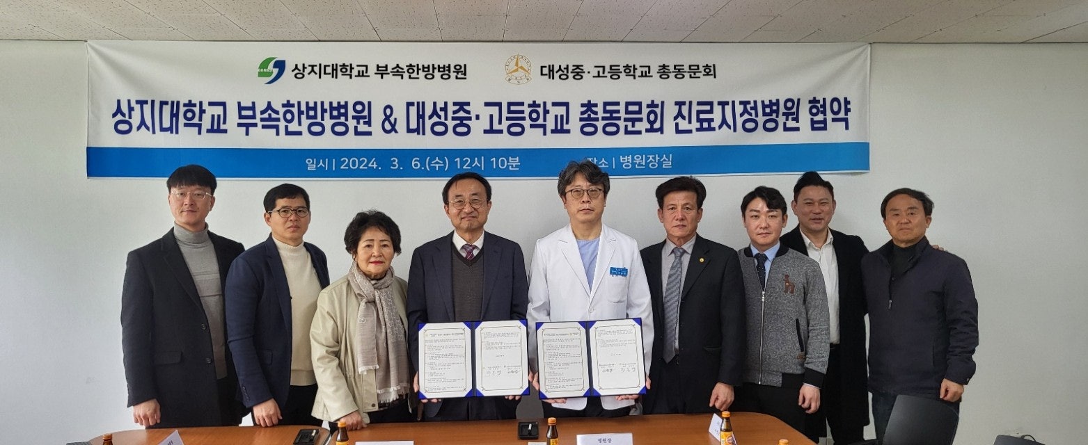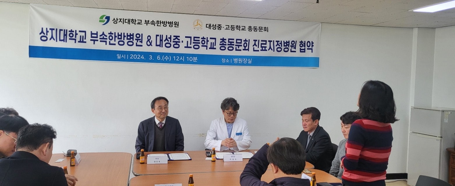 2024년 3월6일(수) 낮12시 10분 상지대학교한방병원과 대성동문회간 업무 협약식이 있었습니다.동문들에게 보다 나은 의료서비스를 제공하고자 대외.협력국에서 추진하여 MOU를 맺게 되었으니 많은 이용 부탁드립니다.