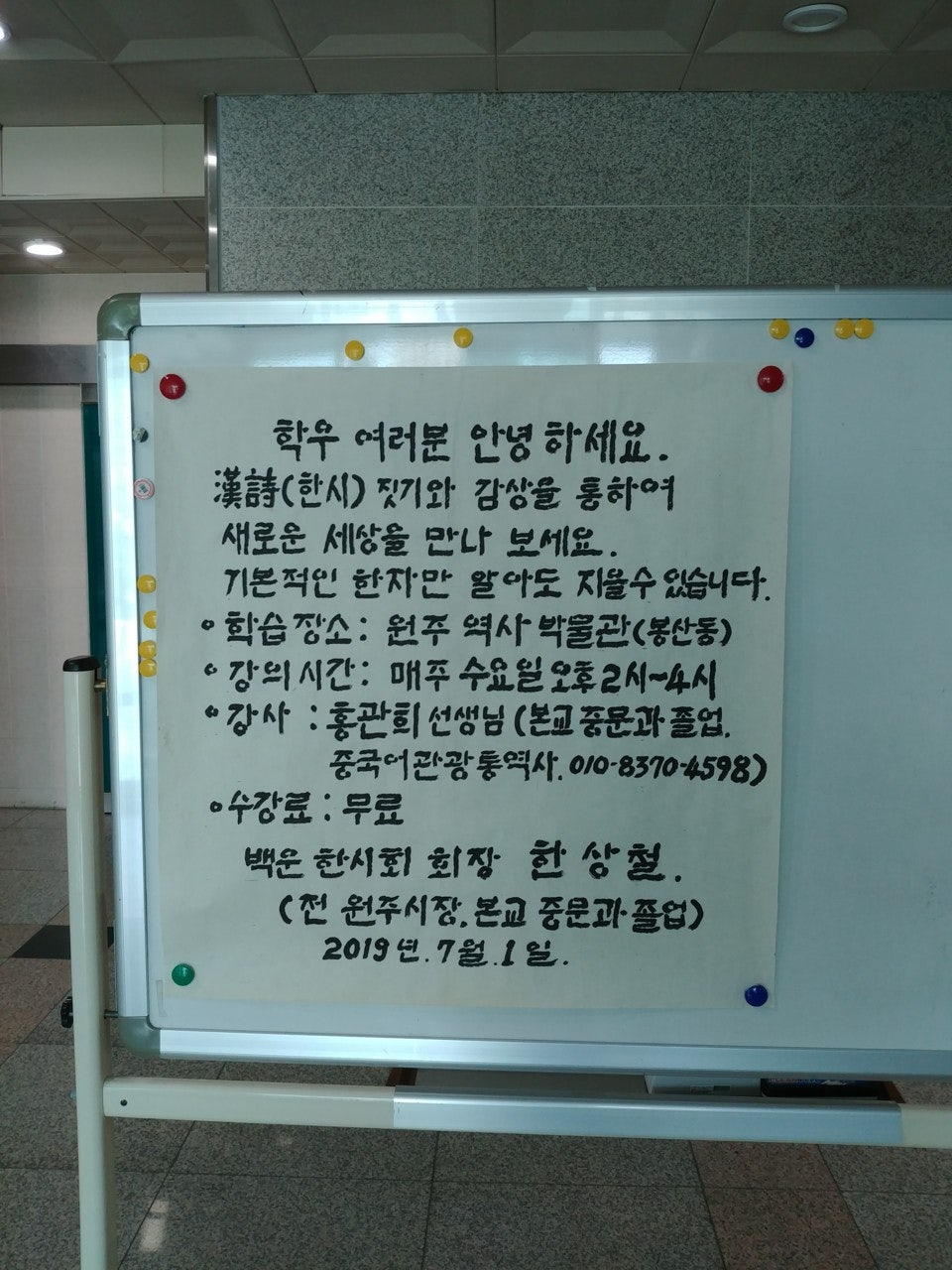 14회 동창회장님을 역임하셨던 홍관희 회장님께서 이번에 봉산동 역사박물관에서 한시 강의를 하게 되셨다고 합니다. 평소 한시에 조예가 깊고 많은 작품활동을 펼치고 계시는데 이번에 강의까지 맡으셨다고 합니다.축하드립니다.